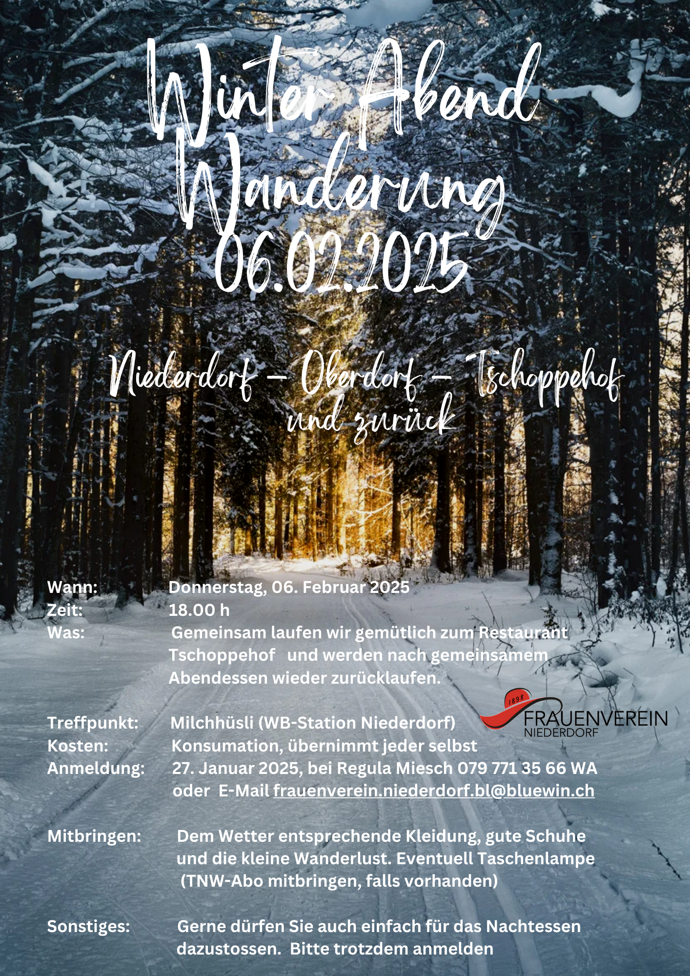 Anmeldung: 27. Januar 2025, bei Regula Miesch 079 771 35 66 WA oder